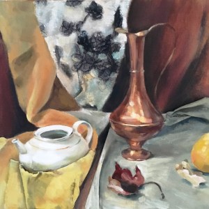 Asetelma päärynä, öljyväri vanerille, 42×63, v.2017