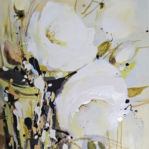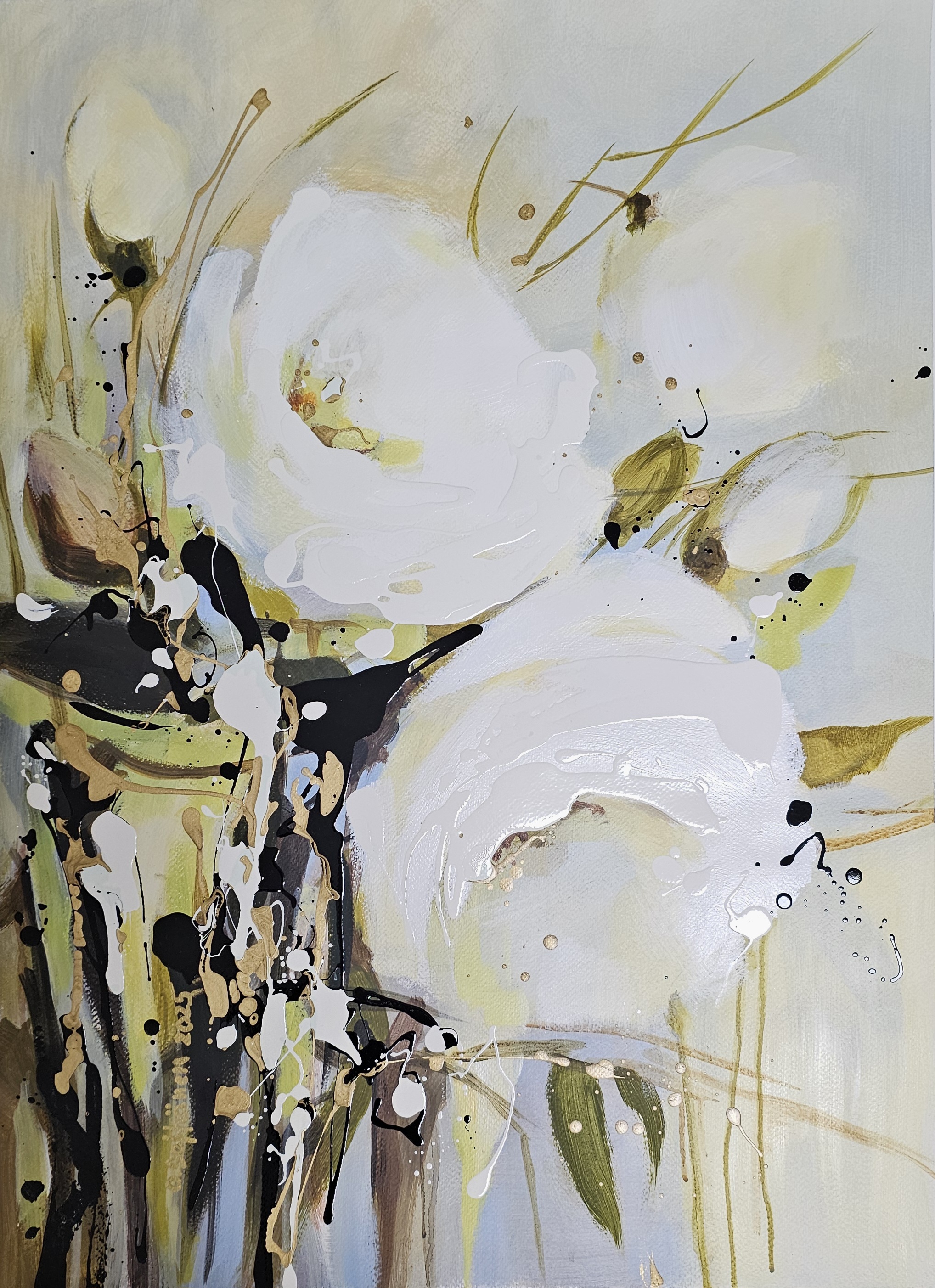 Kukkatarhan aamu, akryyli paperille, 70×50 cm, 2025