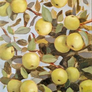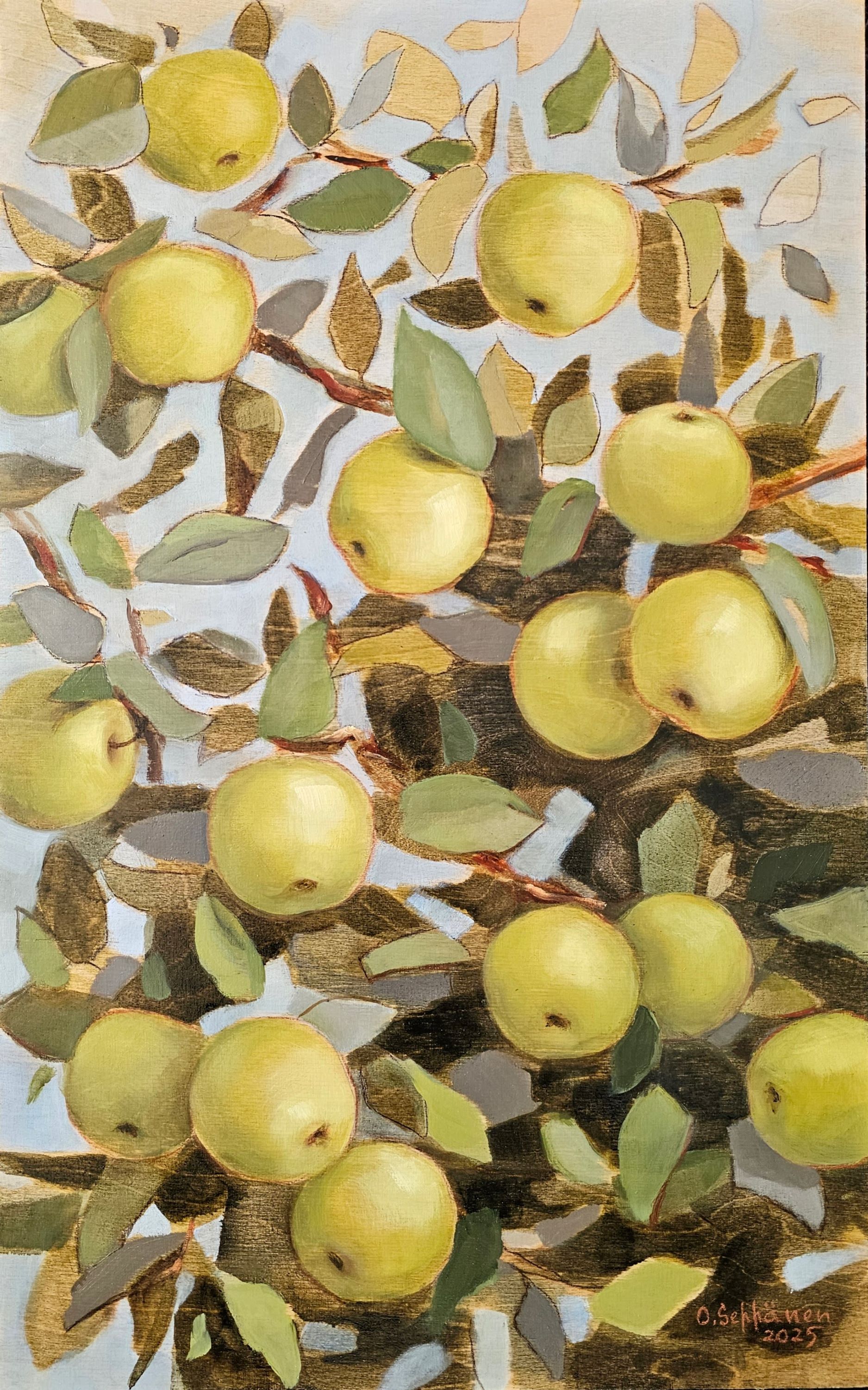 Valo lehtien välissä, öljyväri vanerille, 64×40 cm, 2025