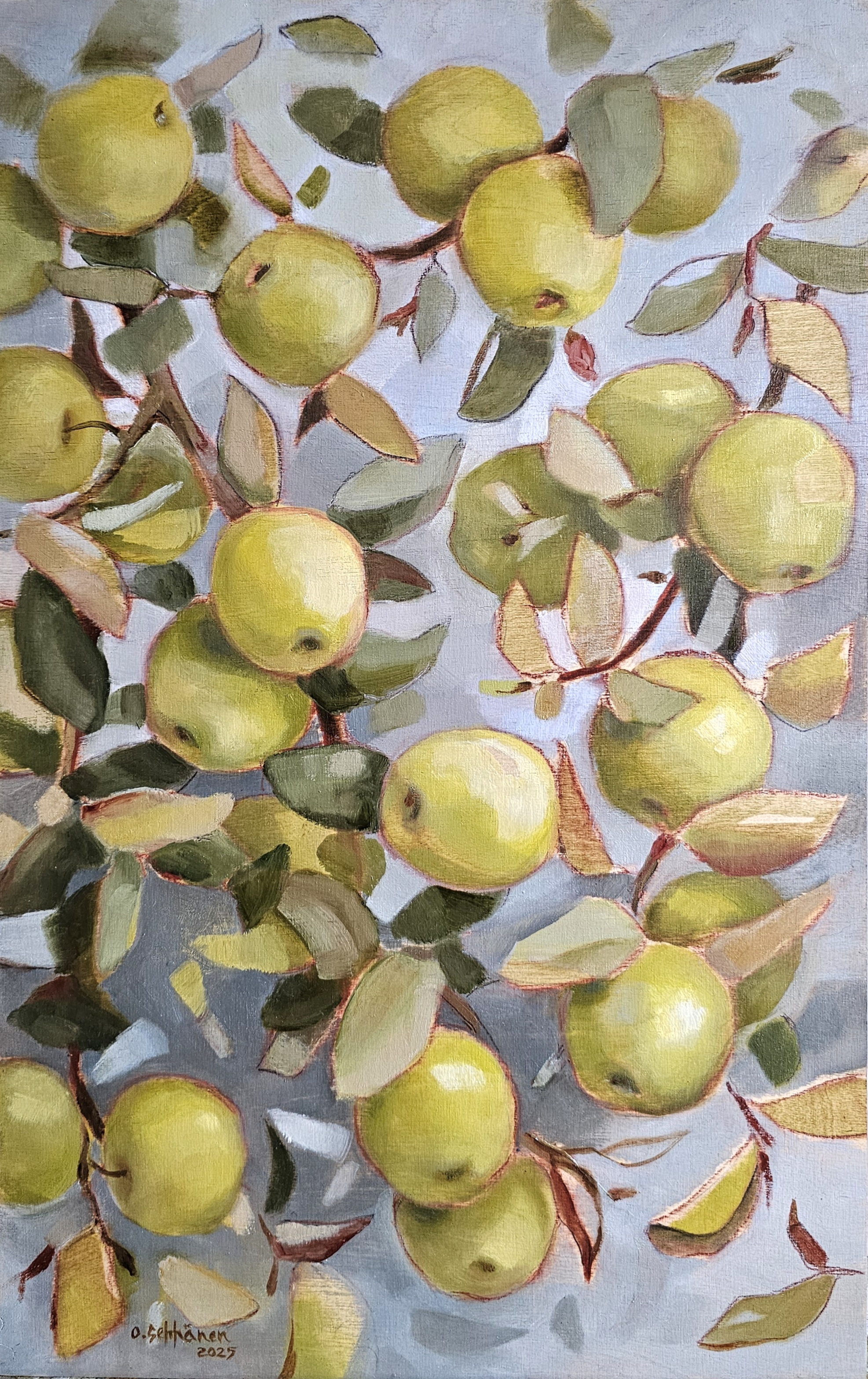 Vihreät omenat,öljyväri vanerille, 64×40 cm,2025