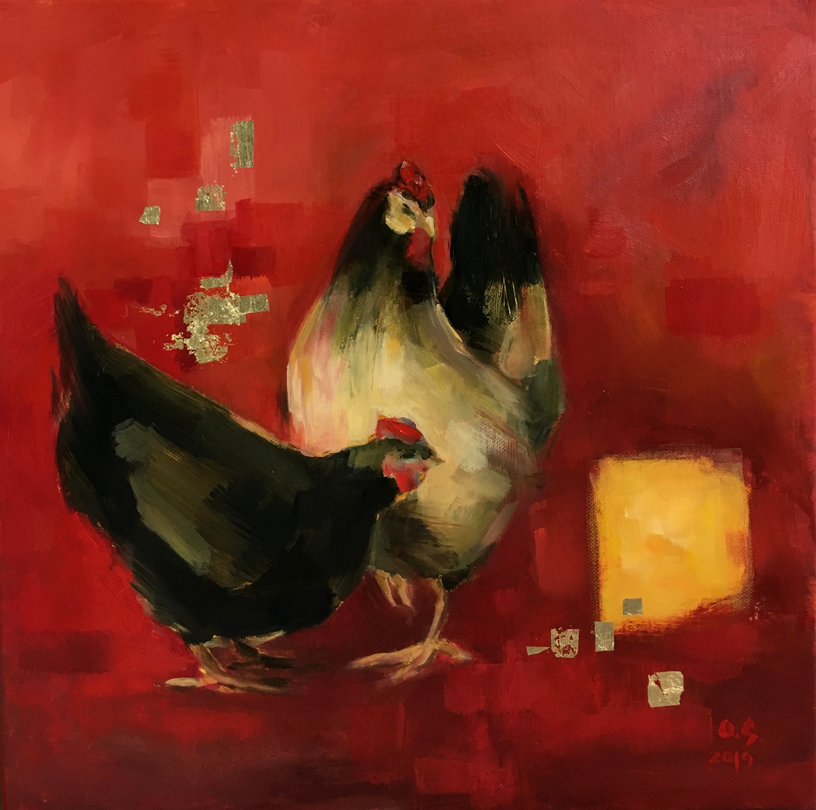 Kaksi kanaa,öljyväri kankaalle, 40x 40 cm, 2019