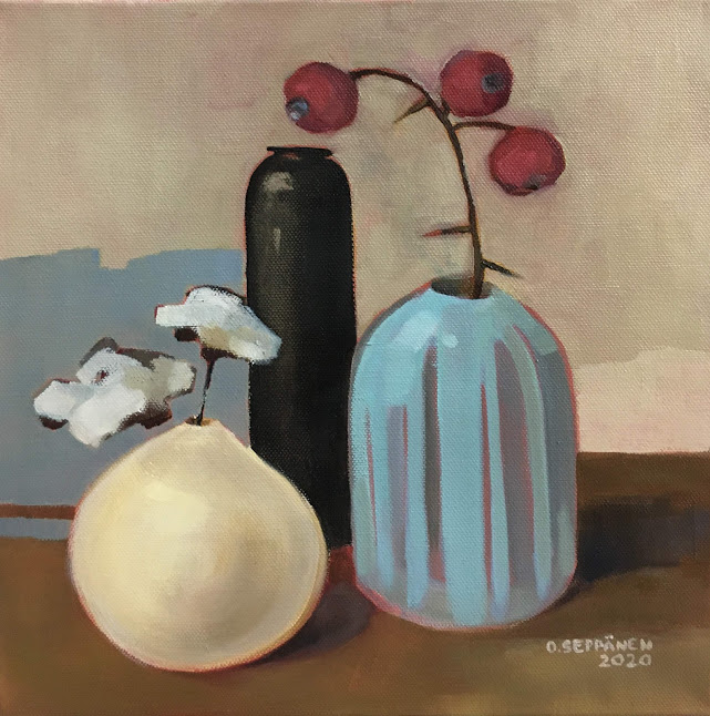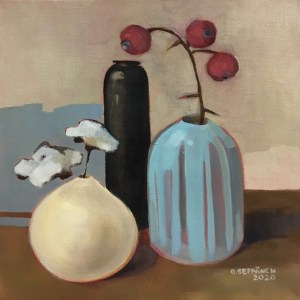 Ruusunmarja vaaleansinisessa maljakossa 30×30 cm, öljyväri ankaalle, 2020